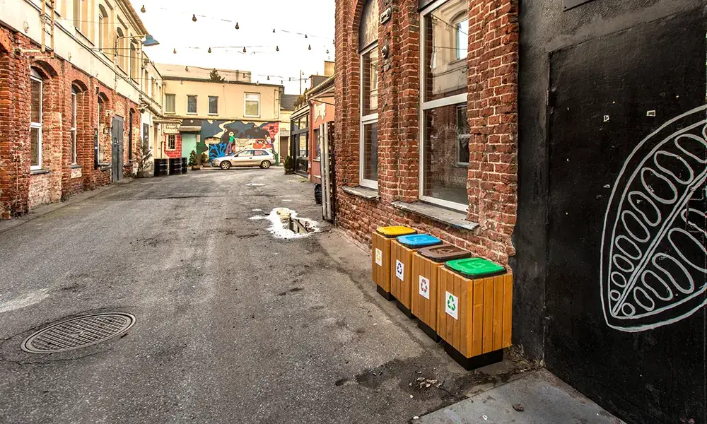 Odpadkový koš EKO-Centurion se dokonale integruje s ostatními prvky uličního mobiliáře.