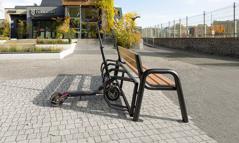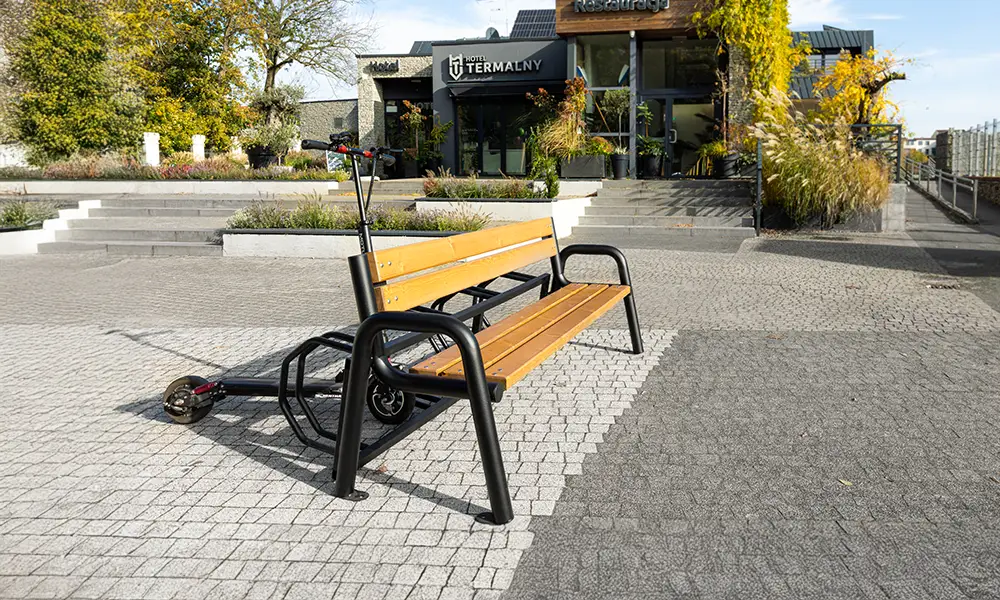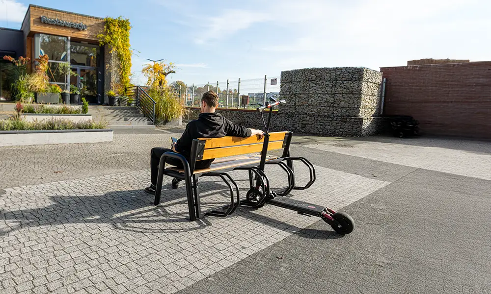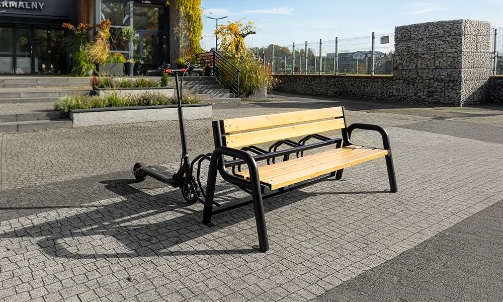 Konstrukce lavičky je založena na pevném ocelovém rámu, odolném proti intenzivnímu používání a proměnlivým povětrnostním podmínkám. Sedák vyrobený z odolných materiálů zajišťuje pohodlí při používání a zachovává si estetický vzhled po dlouhou dobu. Integrovaný stojan umožňuje bezpečné parkování kol a jeho forma umožňuje také pohodlné umístění koloběžek, což z lavičky činí univerzální prvek mobilní infrastruktury.